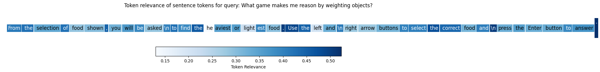from typing import Anyimport torch@torch.inference_mode()def embed_colbert( model: Any, text: str, is_query: bool) ->tuple[list[str], torch.Tensor, torch.Tensor]: prompt_name ="query"if is_query else"passage" task ="retrieval" encode_kwargs = model._validate_encoding_params( truncate_dim=None, prompt_name=prompt_name ) tokenized_outputs = model.processor( text=f"{encode_kwargs['prefix']}: {text}", return_tensors="pt", return_offsets_mapping=True, ) text_toks = [ model.processor.decode(token_id, skip_special_tokens=False)for token_id in tokenized_outputs["input_ids"].squeeze().tolist() ]# Encode using the model embeds = model.encode_text( text, return_multivector=True, return_numpy=True, prompt_name=prompt_name, task=task, )return text_toks, tokenized_outputs["offset_mapping"].squeeze(), embedsdoc_toks_col, doc_offsets_col, doc_embeds_col = embed_colbert( colbert_model, text, is_query=False)# Remove the prefix tokensdoc_toks_col = doc_toks_col[3:]doc_offsets_col = doc_offsets_col[3:]doc_embeds_col = doc_embeds_col[3:]print(f"Number of tokens: {len(doc_offsets_col)}")print(f"Document embedding shape: {tuple(doc_embeds_col.shape)}")assert doc_embeds_col.shape[0] == doc_offsets_col.shape[0], ("Text and offsets should have the same number of tokens ", doc_embeds_col.shape, doc_offsets_col.shape,)query ="What game makes me rea by weighting objects?"query_toks_col, _, query_embeds_col = embed_colbert(colbert_model, query, is_query=True)print(f"Query text tokens: {query_toks_col}")relevances_col = torch.Tensor(query_embeds_col @ doc_embeds_col.T)print(f"Relevance matrix shape: {list(relevances_col.shape)}")